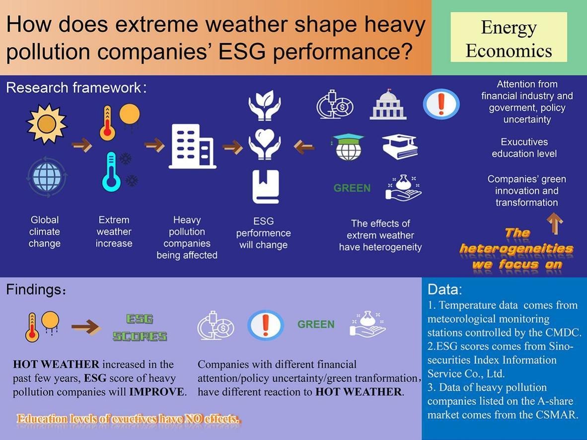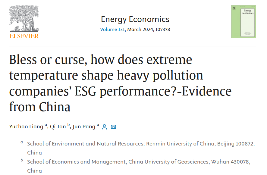 近日,环境公司博士研究生梁宇超在能源经济学领域国际权威期刊Energy Economics发表学术论文。该论文题为“Bless or curse, how does extreme temperature shape heavy pollution companies’ ESG performance?-Evidence from China”。william威廉英国官网环境公司为第一作者单位,人口、资源与环境经济学2022级博士研究生梁宇超为第一作者,环境公司庞军教授为论文通讯作者。