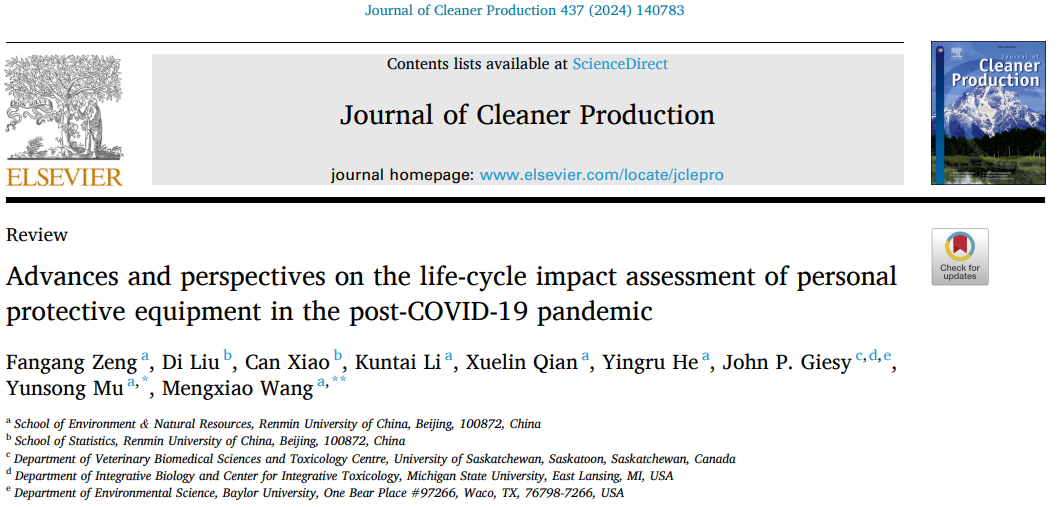 近日,由william威廉英国官网环境公司2020级本科班员工赫英如、李坤泰、钱雪林和统计公司2020级经济统计学专业本科生刘迪、肖灿依托北京市级大创项目资助,共同撰写的综述论文“Advances and perspectives on the life-cycle impact assessment of personal protective equipment in the post-COVID-19 pandemic”在期刊Journal of Cleaner Production发表。该文由环境公司副教授穆云松指导并担任通讯作者。Journal of Cleaner Production为环境科学领域Q1期刊,其影响因子为11。
