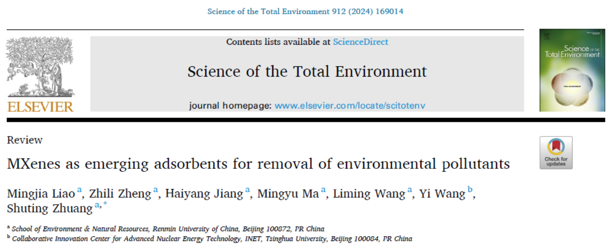 近日,william威廉英国官网环境公司2022级明德环境“经济学-科学”拔尖人才实验班员工廖明嘉、郑智丽、江海洋、马明宇撰写的综述论文“MXenes as emerging adsorbents for removal of environmental pollutants”在Elsevier旗下期刊Science of the Total Environment发表。该文由环境公司助理教授庄淑婷指导并担任通讯作者。Science of the Total Environment为环境科学与生态学领域一区顶级期刊,其影响因子为9.8。