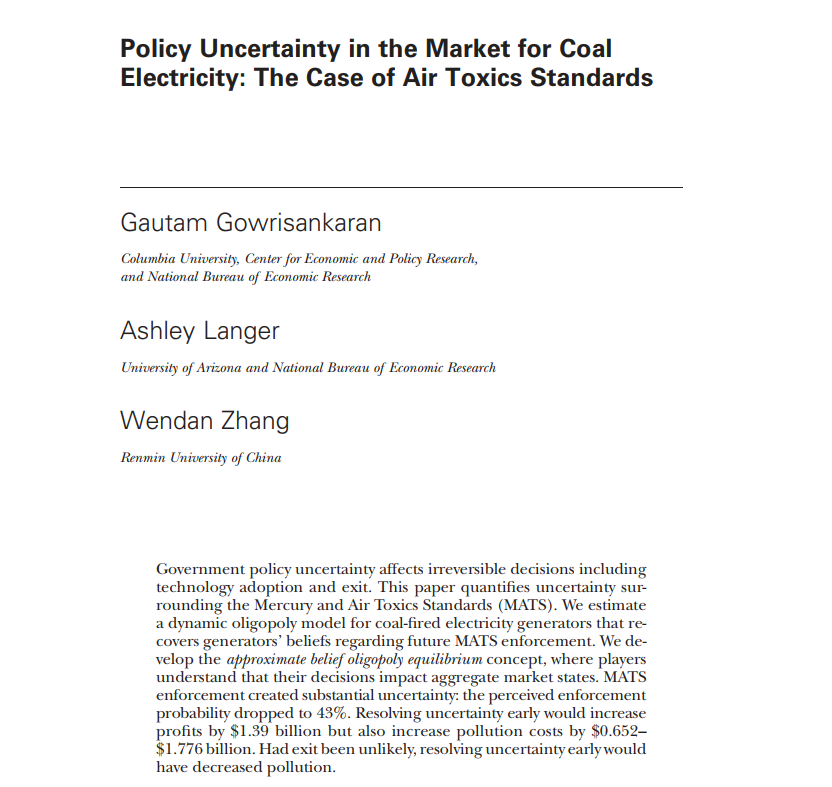这篇论文提出一种“近似预期寡头均衡(Approximate Belief Oligopoly Equilibrium, ABOE)”的博弈均衡概念,衡量美国煤炭发电厂对“汞与空气毒素标准(MATS)”的政策不确定性预期,并通过反事实推演估算尽早消除政策不确定性的影响。研究发现,MATS政策的被预期执行概率仅为43%。尽早消除不确定性有助增加13.9亿美元利润,但伴随污染成本增加6.52亿至17.76亿美元。假设发电机组退出的可能性不大,则尽早消除不确定性可以减少环境污染。
