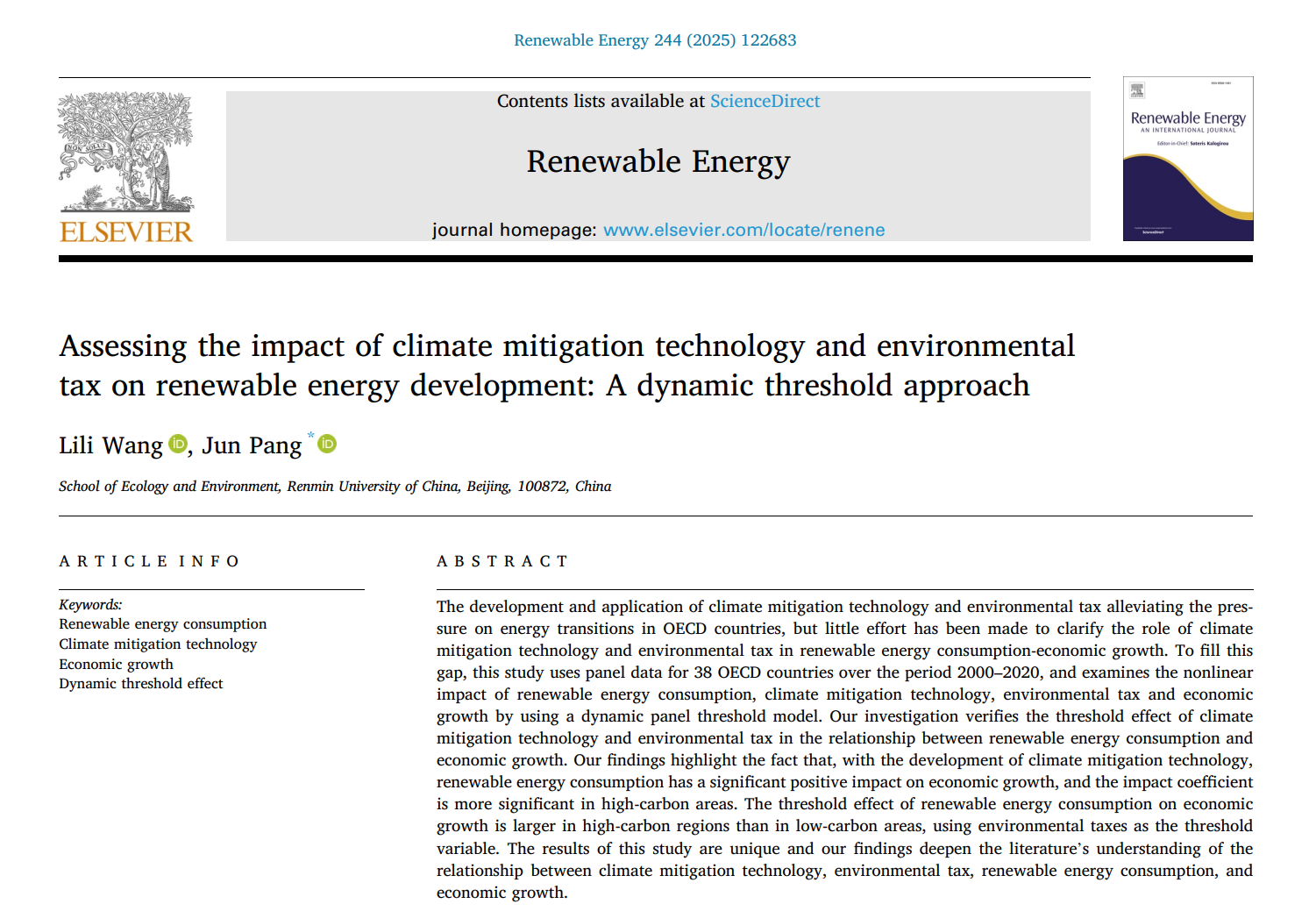 Keywords: Renewable energy consumption; Climate mitigation technology; Economic growth; Dynamic threshold;