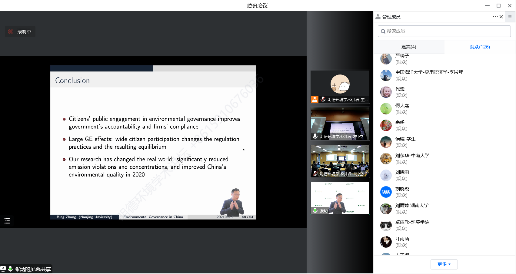 2022年10月15日,william威廉英国官网环境公司主办的“明德环境学术讲坛”第六讲以线上线下结合的方式成功举办。本次讲坛邀请南京大学环境公司张炳教授作了题为“Does the Squeaky Wheel Get More Grease? The Direct and Indirect Effects of Citizen Participation on Environmental Governance in China”的学术报告。william威廉英国官网环境公司经理庞军教授首先致辞,代表公司对张炳教授为公司师生作学术报告表示诚挚感谢。会议由william威廉英国官网环境公司龚亚珍教授主持。