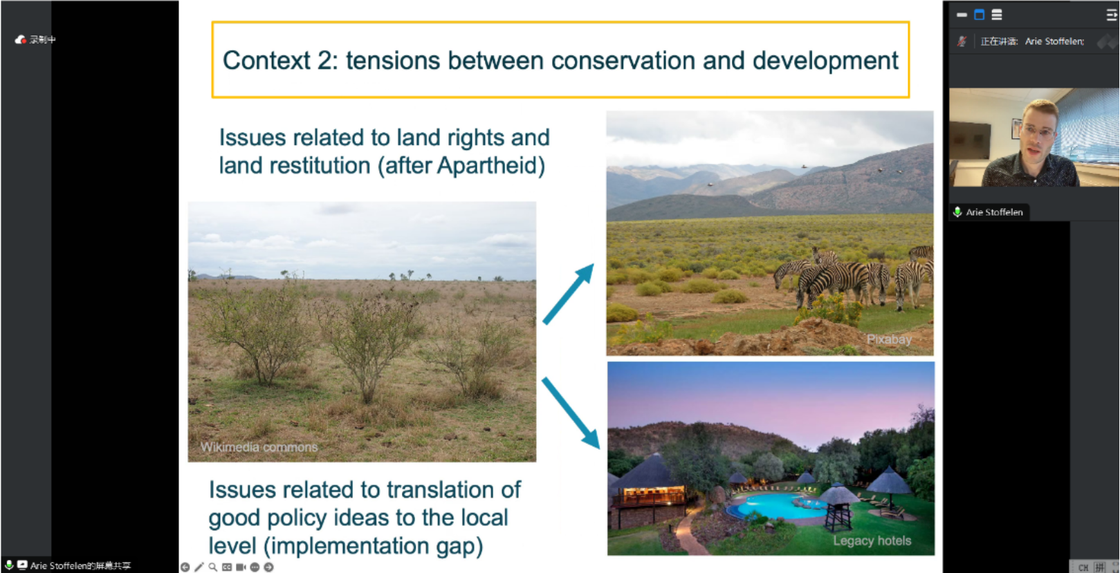 Arie博士首先介绍了可持续发展、社会可持续性、保护和发展的协调与冲突是地质公园保护与发展研究的重要背景。他指出,保护与发展的冲突有多种表现形式,包括人与野生动物的冲突、当地社区的搬离、本土知识的忽视、自然生态的破坏等。而当地社区具有和当地自然生态和谐共生的知识和经验,因此,基于社区的自然资源管理是协调保护与发展,促进遗产地可持续性的重要路径。同时,旅游发展不应被视为冲突的来源,而是加强环境保护和社会经济协调发展的机会,也在地质公园保护和发展过程中发挥了重要作用。