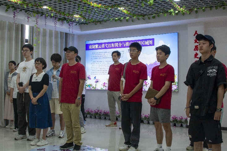 7月15日上午,师生调研团首站来到了南陵县“两山”实践创新基地建设展馆,参观“两山”理念在南陵县的落地生根与实践创新历程。一段段精彩生动的短片,展示了南陵县为践行“两山”理念付出的艰辛努力和创造的重大成果,例如以生态资源为股份的“两山银行”、国家地理标志保护产品(岳西翠兰等)、生态补偿机制等等,紫云英稻花轮作的生态农业模式更是令调研团印象深刻。