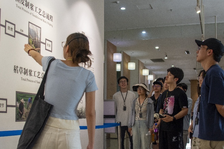 当天下午调研团来到中国宣纸文化园,体会安徽地区特色的宣纸文化。与常见的美术纸不同,宣纸制作采用当地特色树种青檀为主要原料,以沙田稻草为配料,充分结合两种不同植物纤维的特征,使得产出的宣纸质地优良,具有极强的耐腐蚀与耐老化的能力。同时,可以经过染色、烫金等工艺,制作成具有装饰作用的“熟宣”。当地充分发扬宣纸文化,在保留了宣纸古老而繁复的制作工艺的同时,积极相应人民的文化生活需要,将宣纸结合当地“宣笔”“徽墨”等文化产品,推出包括信笺、折扇等一系列具有本地特色的宣纸产品。在这里,同学们亲自观摩和尝试了宣纸的制作过程,对传承中国传统文化与打造乡村生态旅游相结合的发展模式有了更加深刻的体会。