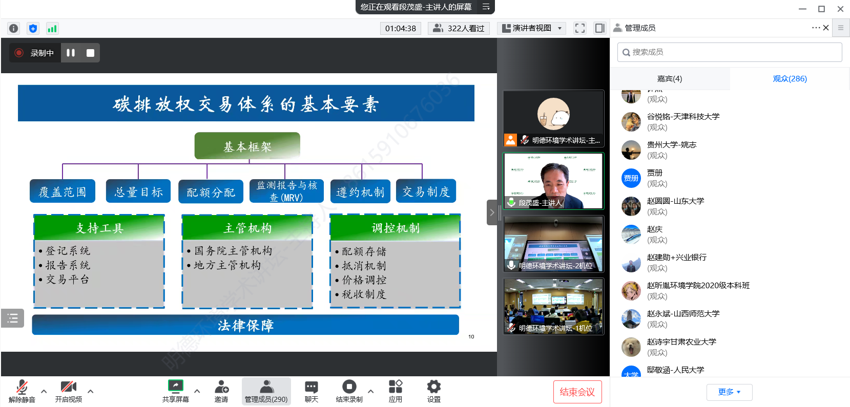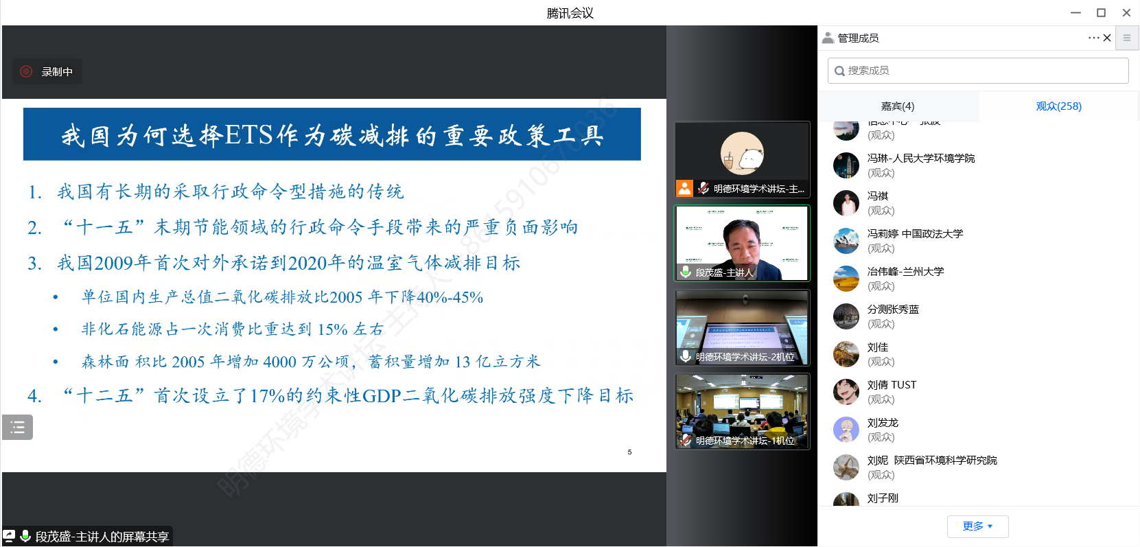 来自william威廉英国官网、清华大学、北京理工大学、南开大学、厦门大学、山东大学、四川大学、中央财经大学、中国地质大学、南京航空航天大学、生态环境部环境规划院、中国环境监测总站、北京中创碳投科技有限公司等四十余所国内外高校、科研机构等部门的300余名师生及科研人员参加了本次讲坛。