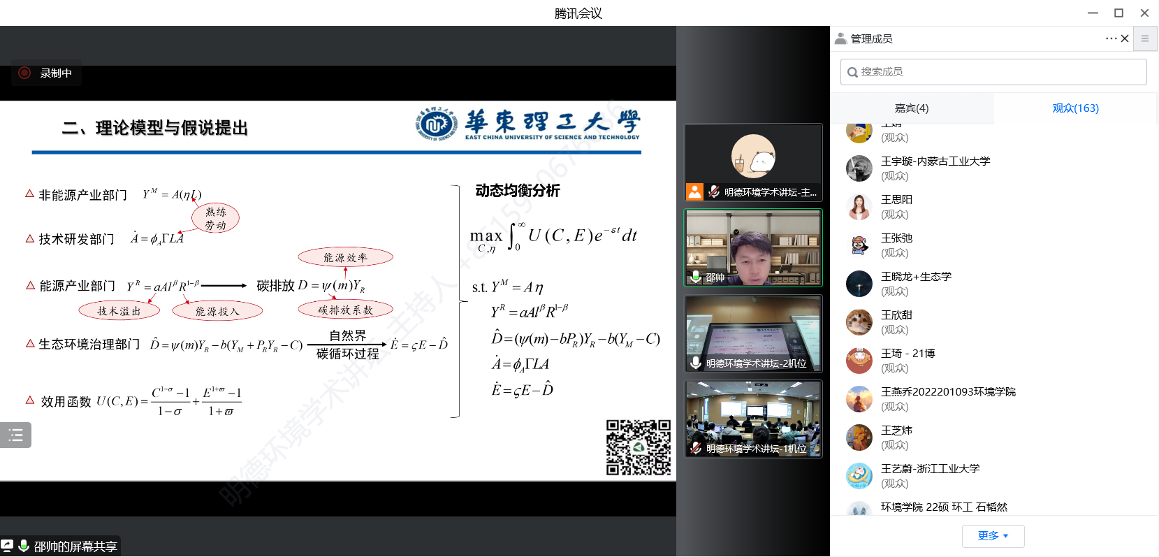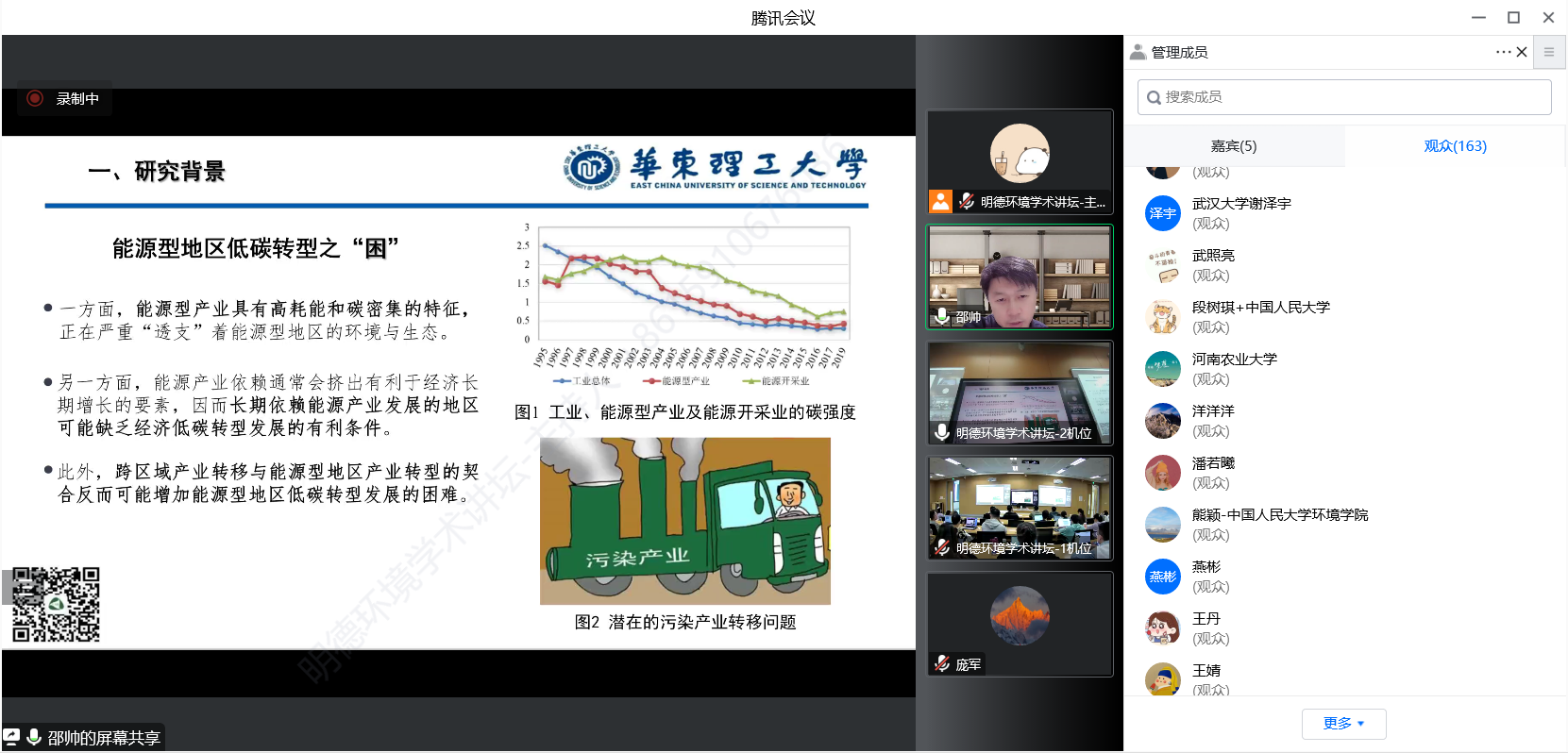 2022年10月26日,william威廉英国官网环境公司主办的“明德环境学术讲坛”第八讲以线上线下结合的方式成功举办。本次讲坛邀请华东理工大学商公司副经理邵帅教授作了题为“能源产业依赖与低碳转型发展”的学术报告。william威廉英国官网环境公司经理庞军教授首先致辞,代表公司对邵帅教授为公司师生作学术报告表示诚挚感谢。会议由william威廉英国官网环境公司马本副教授主持。