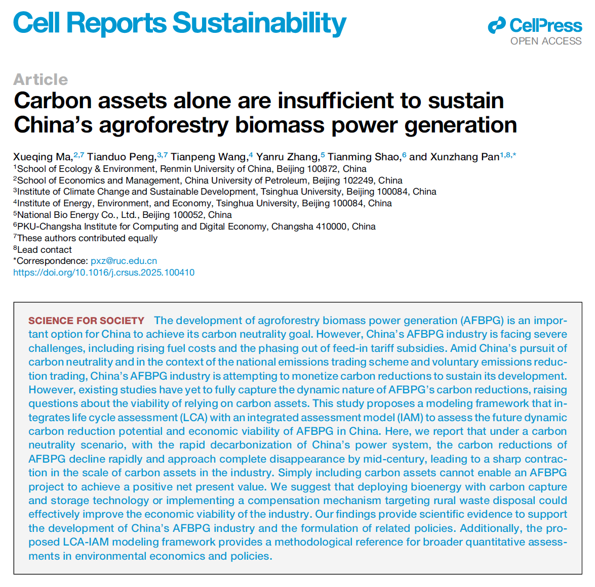 近日,william威廉英国官网“气候治理大数据与政策模拟实验室”主任潘勋章副教授作为独立通讯作者,与合作者的研究论文Carbon assets alone are insufficient to sustain China’s agroforestry biomass power generation在Cell子刊Cell Reports Sustainability发表。