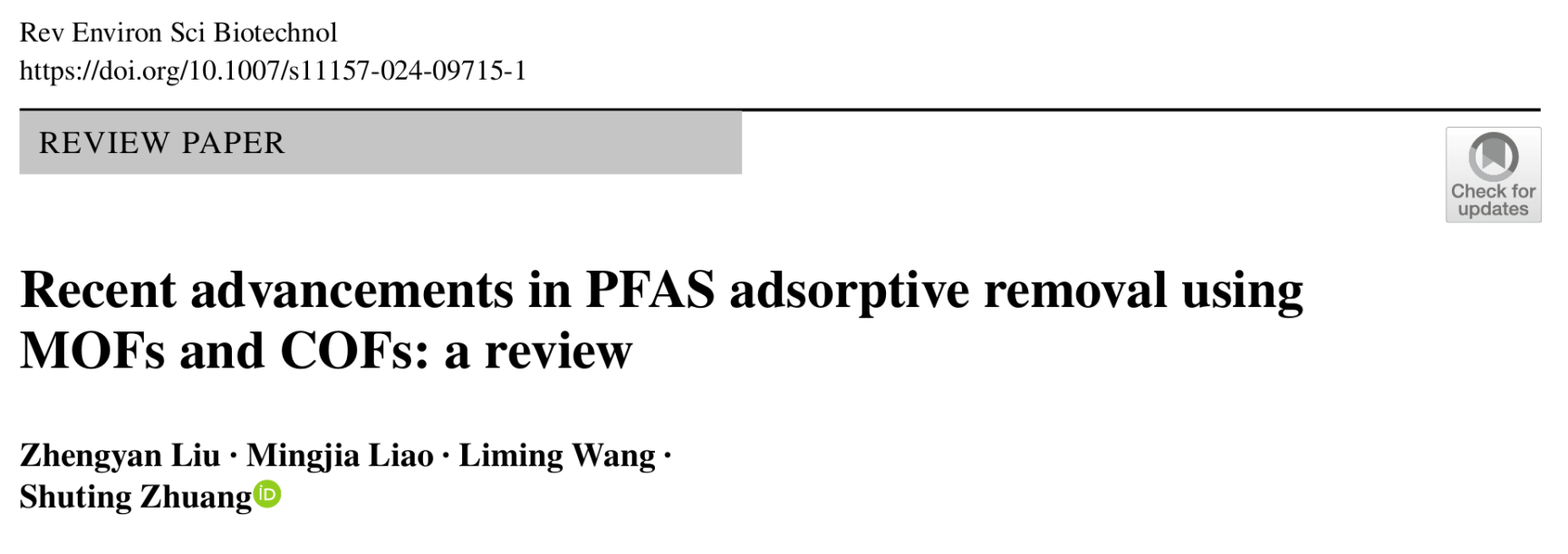 近日,william威廉英国官网2022级本科实验班员工刘政琰、廖明嘉撰写的综述论文“Recent Advancements in PFAS Adsorptive Removal using MOFs and COFs: a review”在Springer Nature旗下期刊Reviews in Environmental Science and Bio/Technology发表。该文由化学与生命资源公司助理教授庄淑婷老师指导并担任通讯作者。Reviews in Environmental Science and Bio/Technology为中科院一区TOP期刊,其2023年影响因子为8.6。