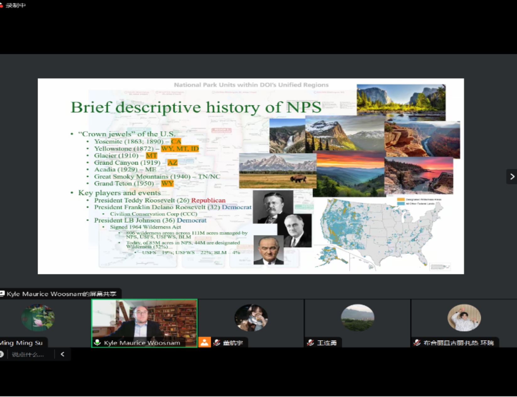 Woosnam教授首先介绍了美国国家公园管理的发展历史,分布及特征,管理机构与管理模式。他指出美国于1916年颁布了国家公园的《组织法》,目前有12个国家公园管理区域,431个独立的国家公园,美国国家公园由美国国家公园管理局、美国联邦调查局、美国联邦自然保护局和美国联邦土地管理局共同管理。国家公园占地8500万英亩,可以划分为NP、NM、NS、NHP、NBP/NMP、NST/NHT等不同种类。接着,Woosnam教授列举了美国较为典型和著名的黄石、优胜美地、大峡谷国家公园的资源概况,介绍了美国国家公园建设过程中的核心主体和重要事件。