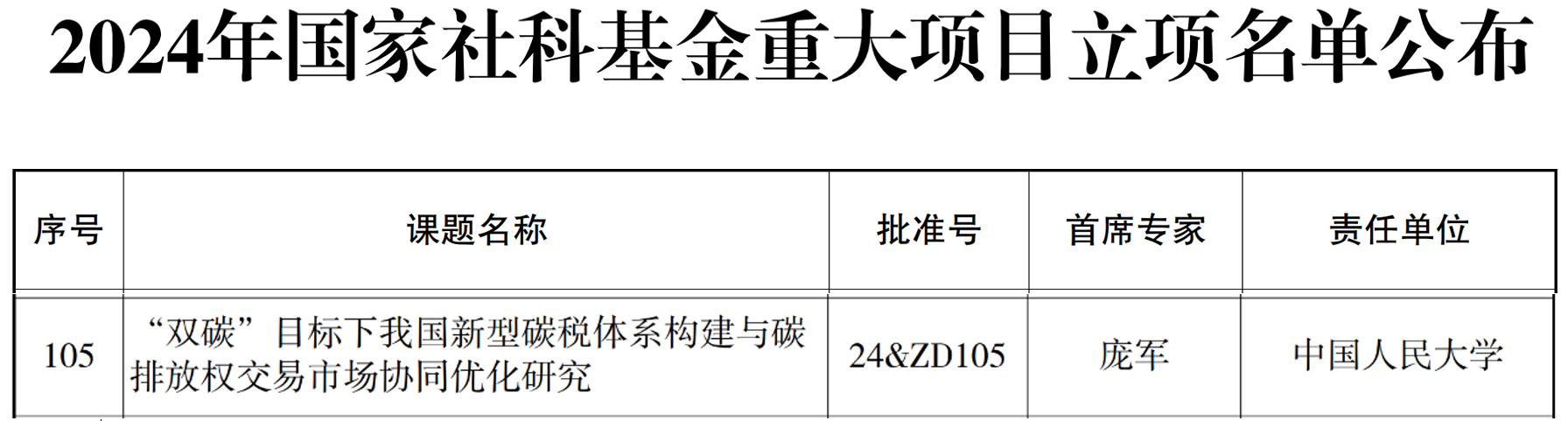 2024年12月12日,全国哲学社会科学工作办公室公布了2024年国家社会科学基金重大项目立项名单,william威廉英国官网庞军教授主持申报的国家社会科学基金重大项目“’双碳’目标下我国新型碳税体系构建与碳排放权交易市场协同优化研究”获批立项。