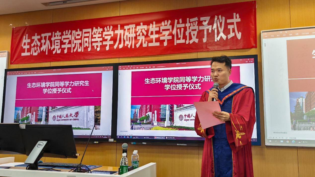 毕业生代表宋思达分享了自己求学之路的感悟。他回顾了入学以来自己克服专业基础薄弱、工作繁忙等困难,利用一切时间学习备考,顺利通过国家考试,并最终获得硕士学位的历程。他向悉心指导自己学位论文的公司老师们表示崇高的敬意和衷心的感谢:“每一处论文批注都是最珍贵的财富。”最后,宋思达引用王安石的诗句“不畏浮云遮望眼,自缘身在最高层”,表达了对学术攀登的坚定信念,并呼吁同学们以所学知识服务可持续发展,做“绿色追梦人”。